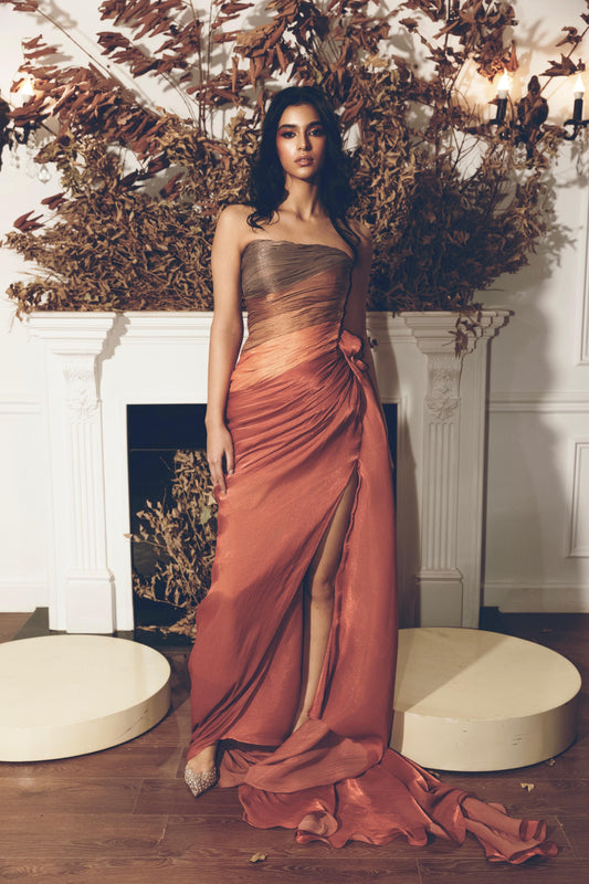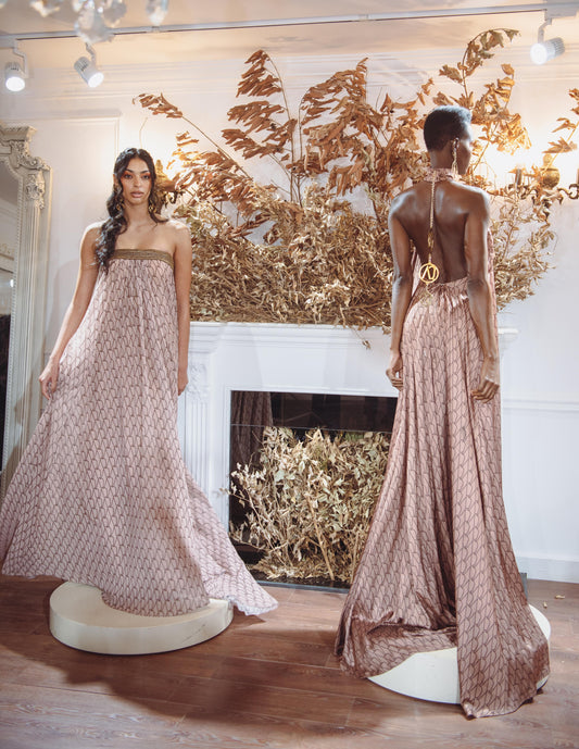 Each silhouette whispers the secrets of the mountains, painted by the sunset’s glow: Couture inspired by nature’s evening embrace and the breathtaking transitions of color over majestic mountain ranges.