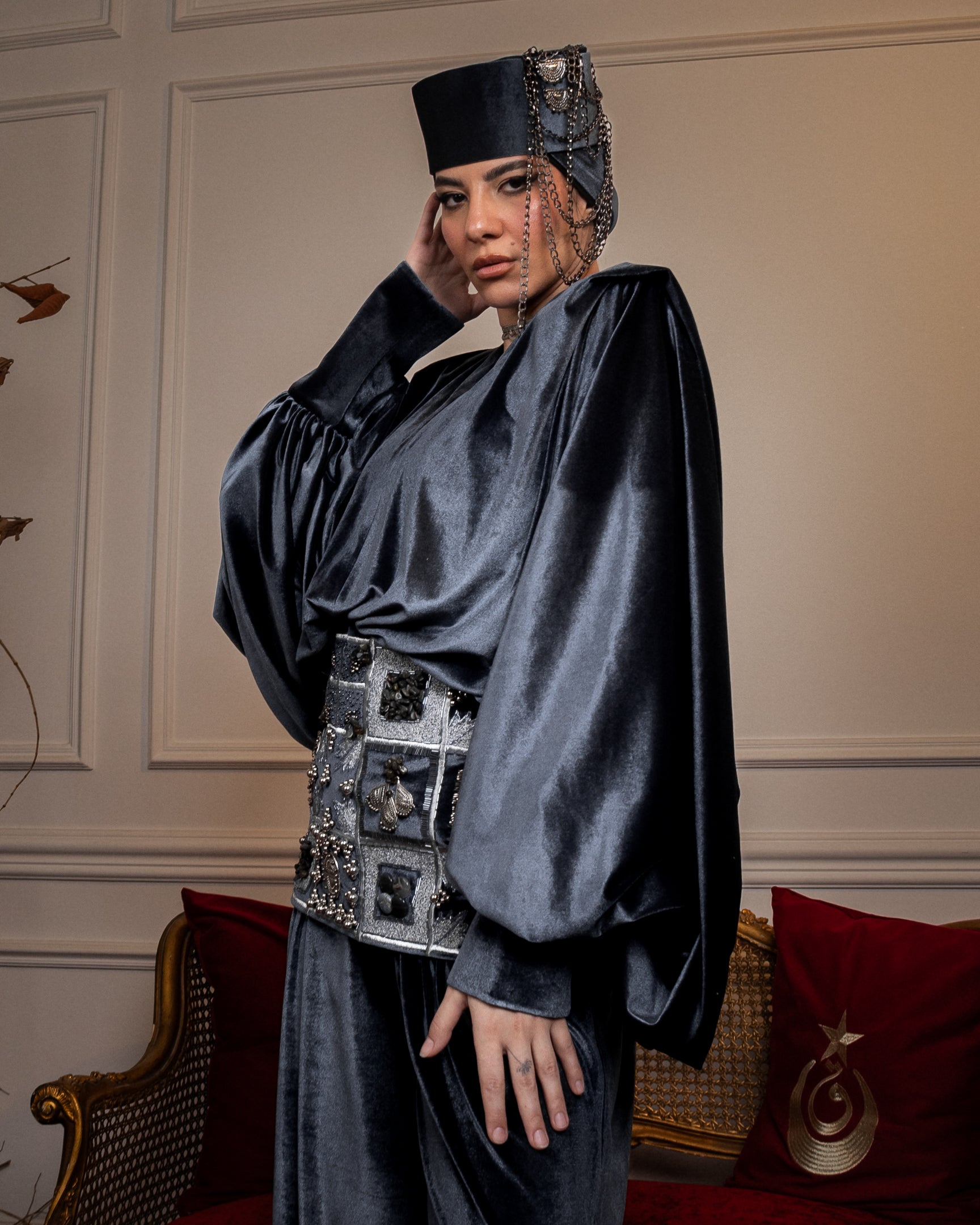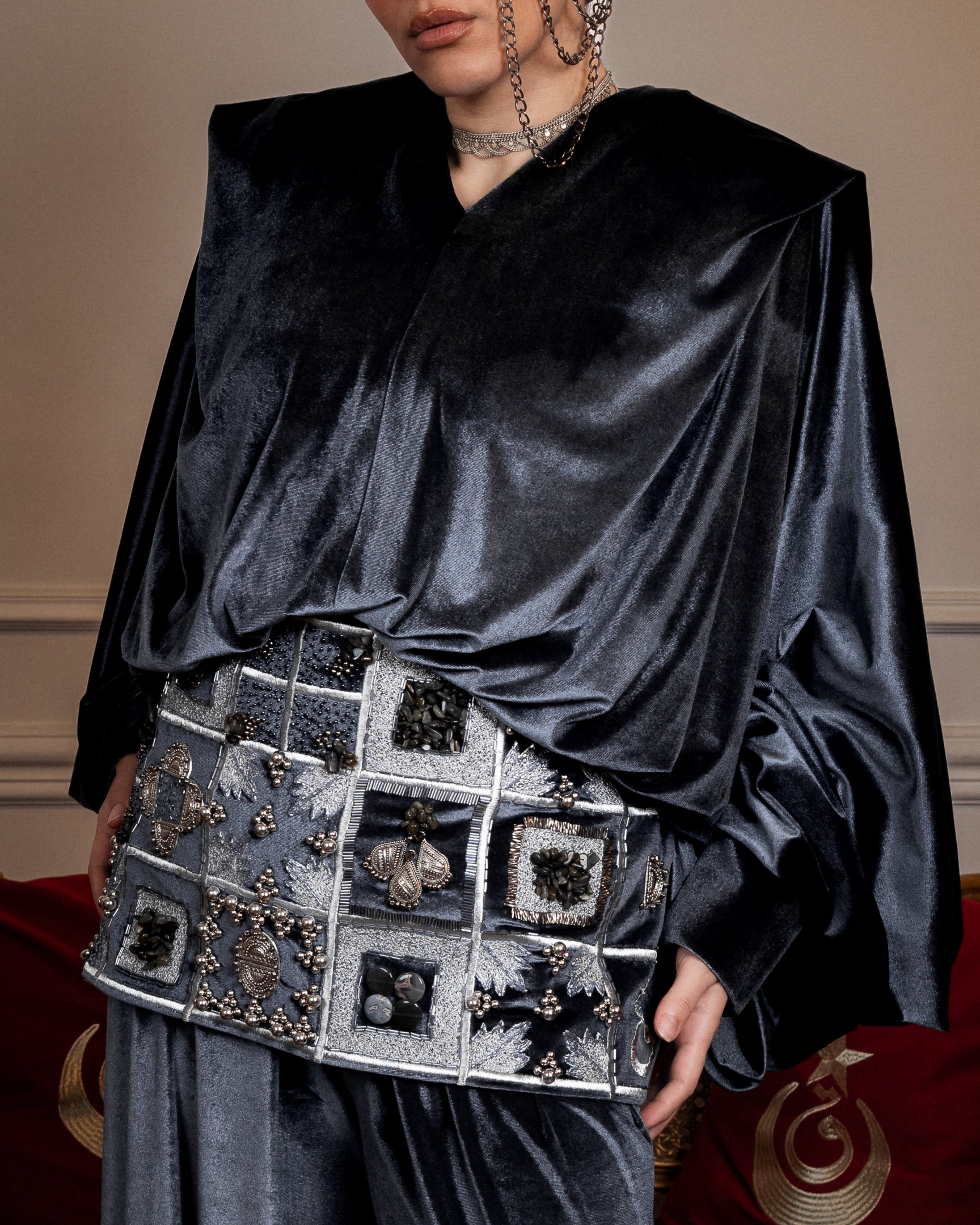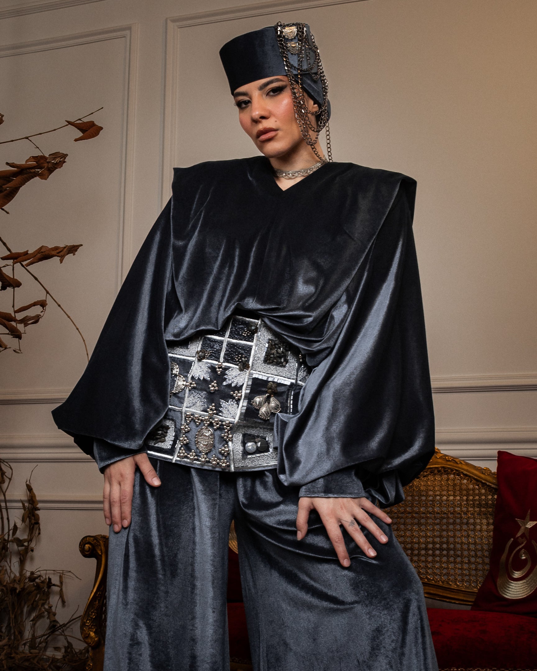 A two-piece set in luxurious brown velvet, with refined draping and defined shoulders that create a strong, balanced silhouette. Finished with an embroidered corset belt, detailed with crystal, pearls, and brass accents, handcrafted with care and designed with precision in every detail.