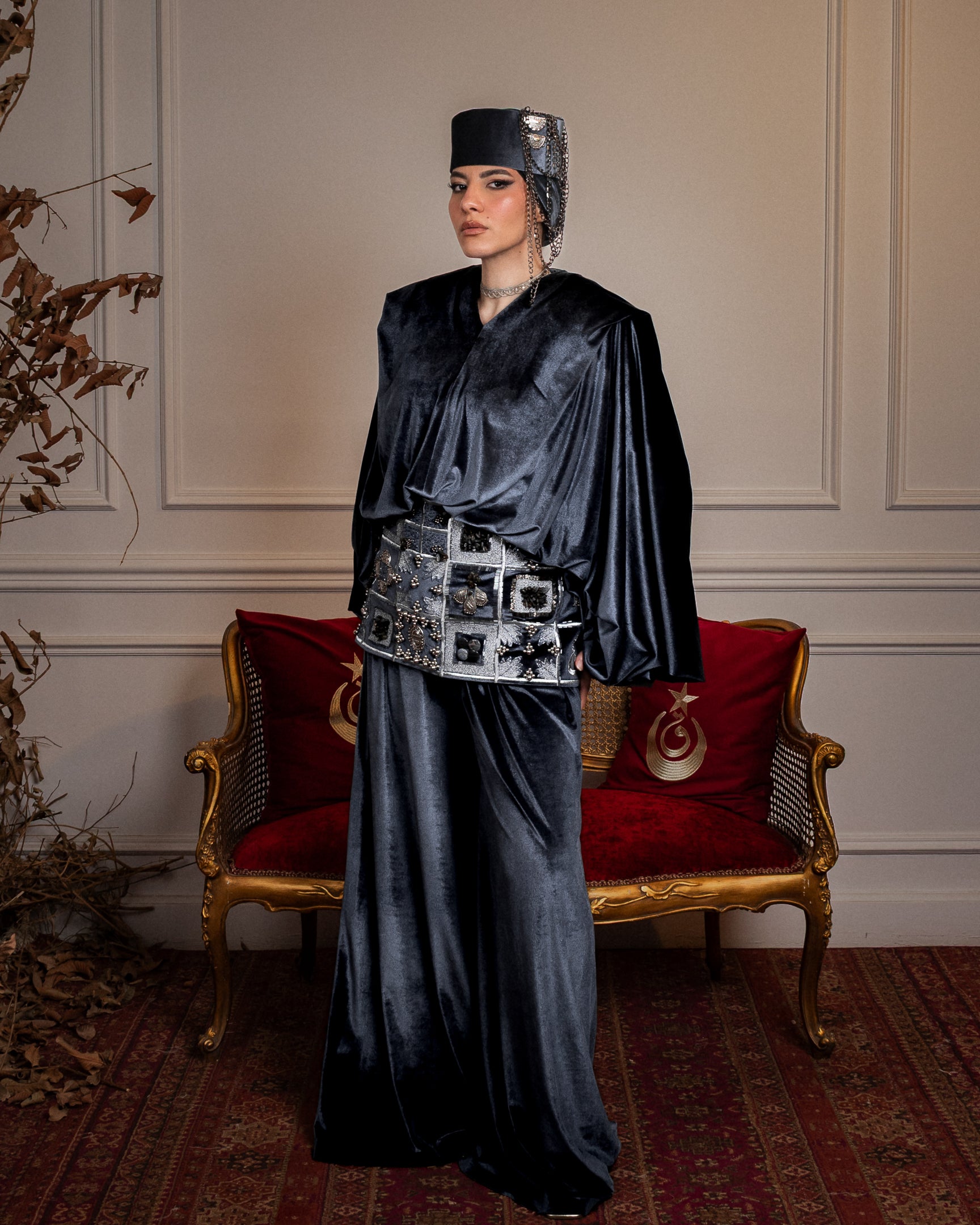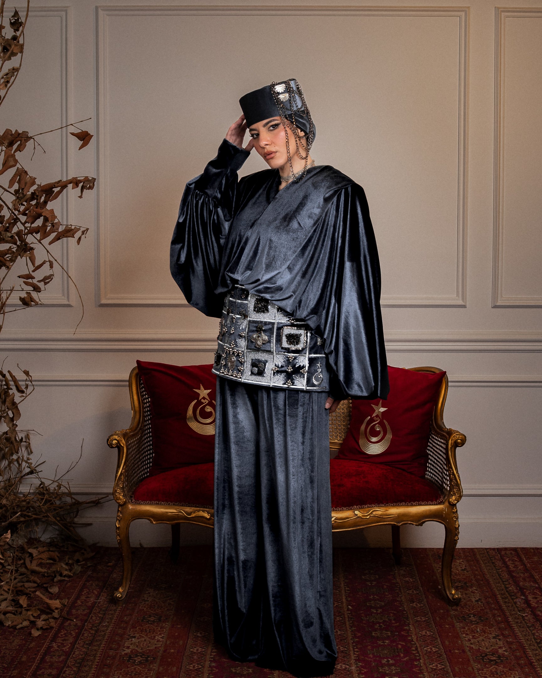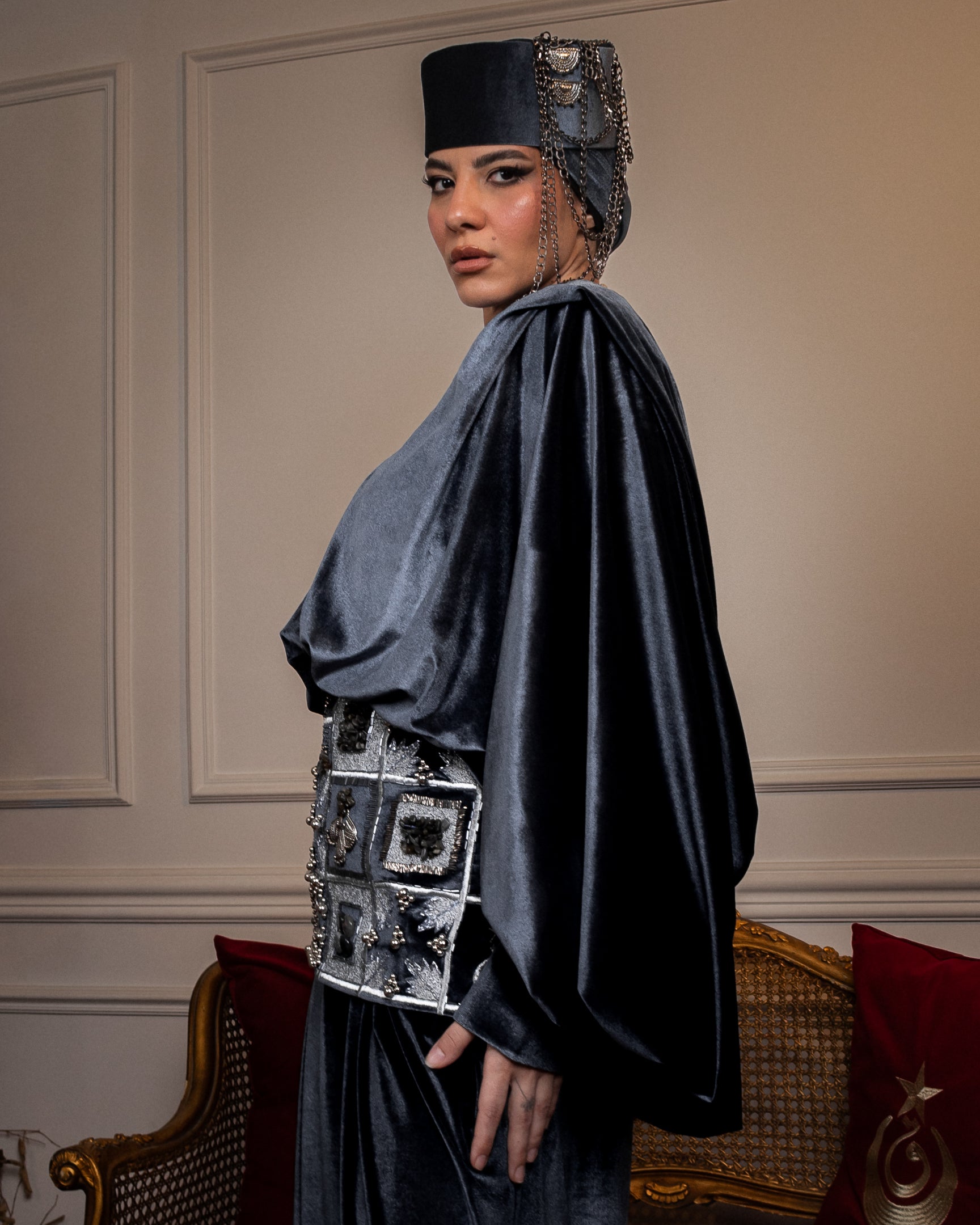 A two-piece set in luxurious brown velvet, with refined draping and defined shoulders that create a strong, balanced silhouette. Finished with an embroidered corset belt, detailed with crystal, pearls, and brass accents, handcrafted with care and designed with precision in every detail.